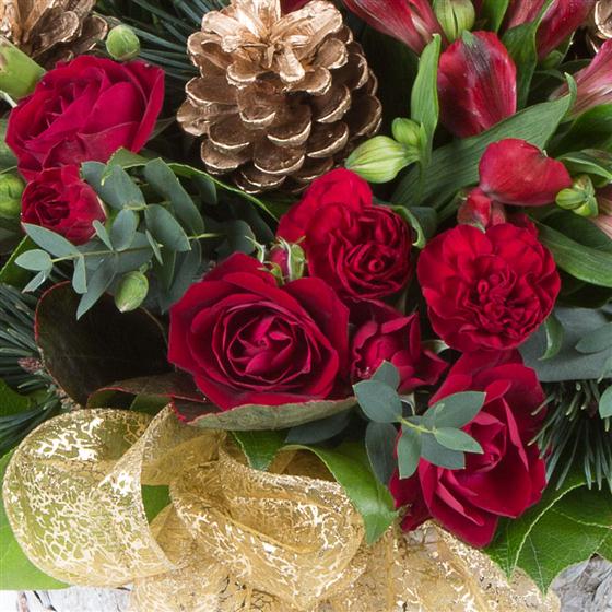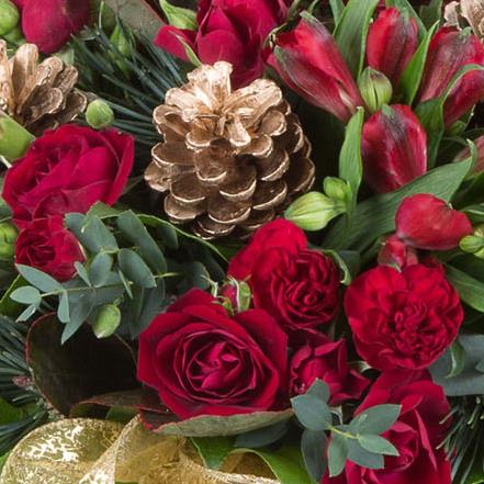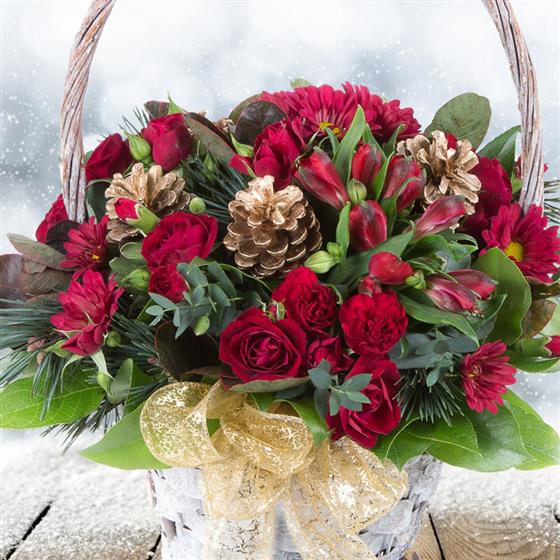 A beautiful mixed basket arrangement in reds and golds including seasonal spruce, cones and berries.