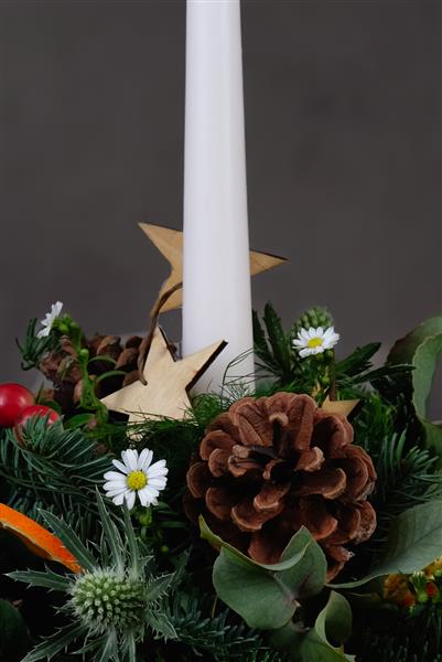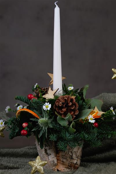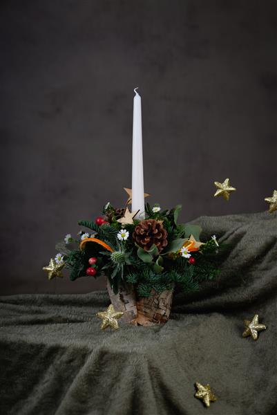 Starry night candle arrangement features gold stars, fruits, berries and cones amongst festive greenery.