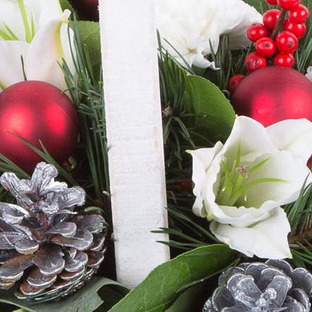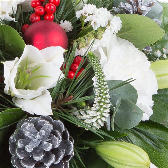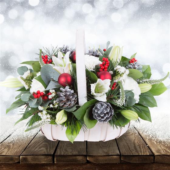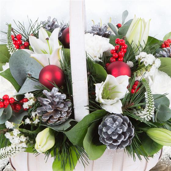 White Lilies amongst green, red & silver blooms and packed with fragrant festive foliage's, this basket arrangement is a joy to the senses.