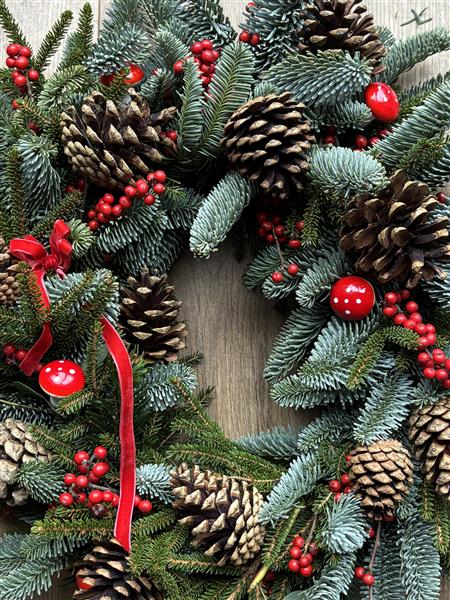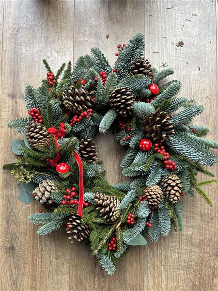 Large woodland wreath. Including cones & toadstalls amongst festive greenery and berries.